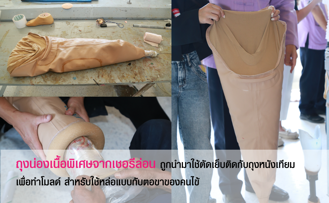 โดยถุงน่องสำหรับบริจาคจะแบ่งออกเป็น 2 ประเภท คือถุงน่องชนิดพิเศษที่เชอรีล่อนผลิตเพื่อบริจาคให้กับมูลนิธิโดยเฉพาะ ไว้สำหรับการทำโมลด์(ถุงโฟม) ขึ้นรูปขาเทียม จำนวน 600 8 คู่ และถุงน่องแบบทั่วไป ไว้ใช้งานในด้านของการสวมใส่กับผู้พิการ เพื่อช่วยห่อหุ้ม ลดแรงเสียดสี และนำใช้ผลิตขาเทียมขั้นตอนต่าง ๆ จำนวน 400 คู่