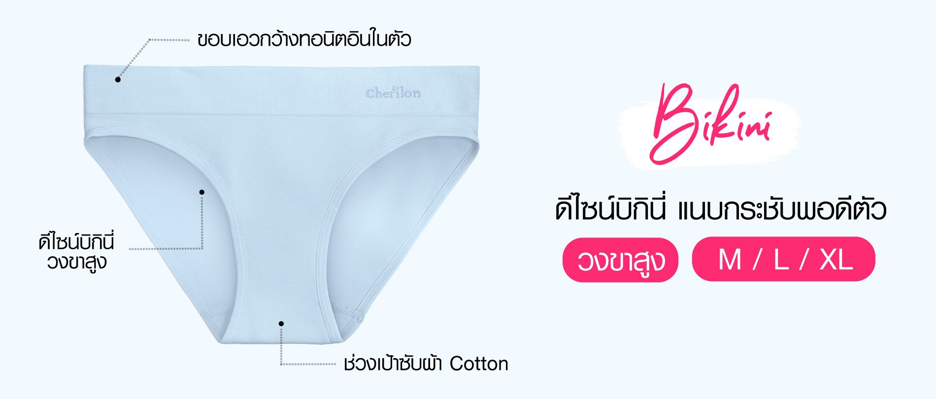 กางเกงในทอไร้ตะเข็บ เชอรีล่อน อินทิเมท แบบครึ่งตัว รูปทรงเพรียวสวย เนื้อผ้าทอกระชับ เบาสบาย เนียนแนบ ยืดหยุ่นพอดี ทั้งช่วงเอวและขอบขา ช่วงเป้าซับด้วยผ้า Cotton คุณภาพดี