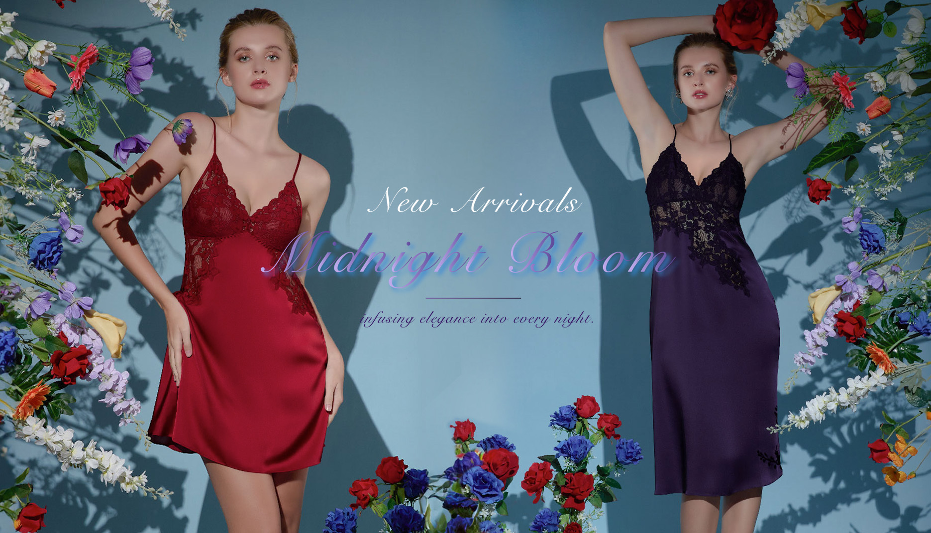เปิดเสน่ห์น่าค้นหา ชวนหลงใหล กับชุดนอนคอลเลคชั่นใหม่ที่ได้แรงบันดาลใจมาจากดอกไม้ยามราตรี ด้วยโทนสีแดงไวน์ และสีม่วงไวโอเลต ช่วยขับผิว สวยผ่องยามค่ำคืน